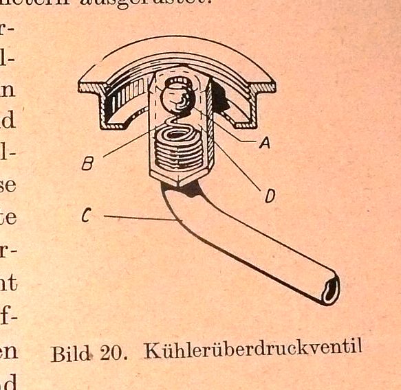 Auf dem Kühlerdeckel bfindet sich ein kleiner Buckel, in dem das Überlaufrohr endet. Darin soll es ein Überdruckventil geben. Ich habe die Info vom Hörensagen. Ich wäre auch interessiert, ob das eigentlich stimmt. Zum Reingucken ist mir mein Kühler zu schade.