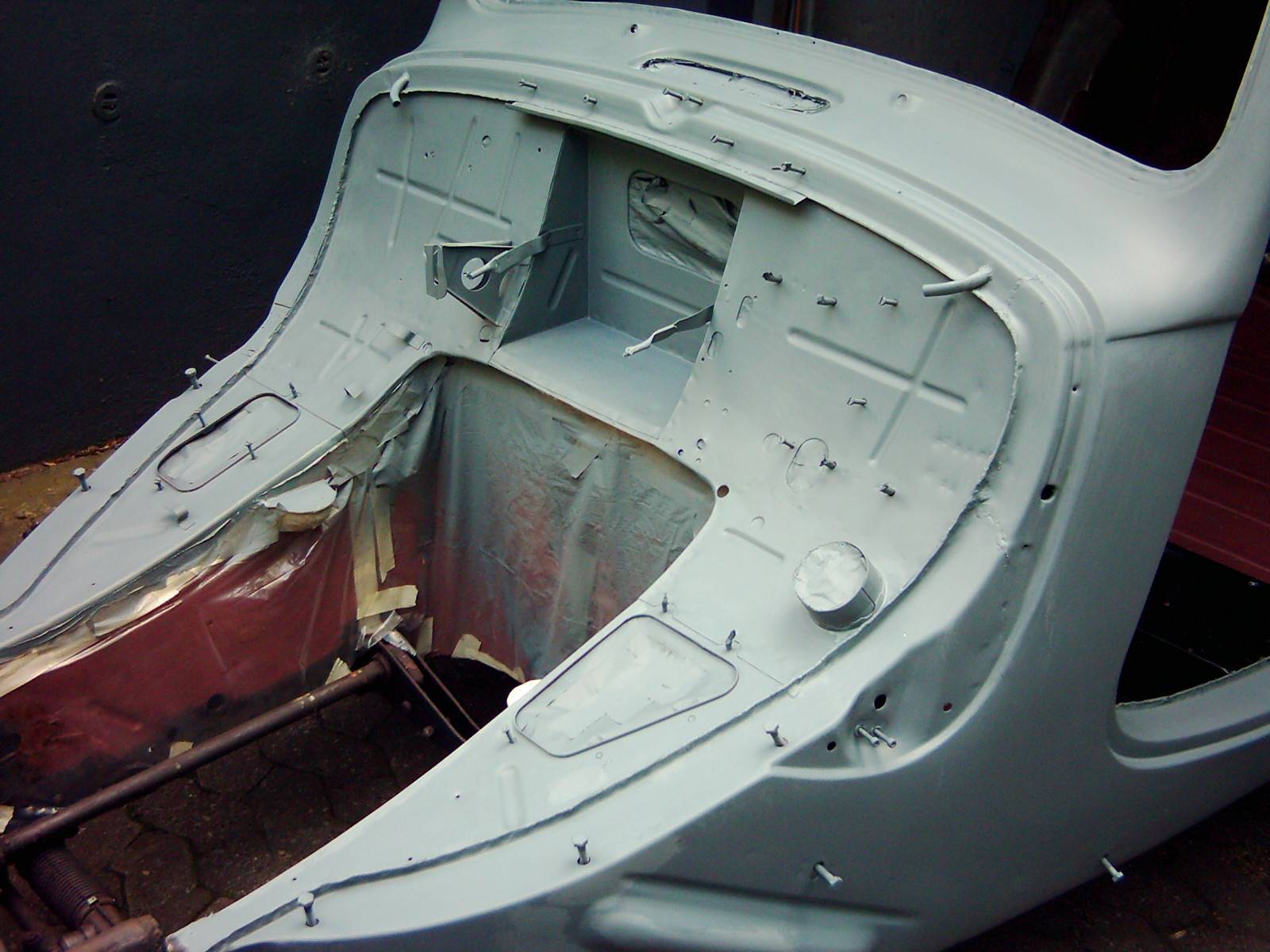 Danke für die weiterhelfenden Bilder. (Peter: Klasse Deine Idee mit der Drehbühne!) Damit war es mir möglich, mit Balsaklingen, Gitarrensaiten und einem langen Brotmesser den rundum eingeklebten Kasten herauszulösen. Was für ein Pfusch! Überall dick Silikonkautschuk drüber, darunter nix grundiert und dann rundum mit 15 mm Schaumgummimatten egalisiert (im doppelten Wortsinne).