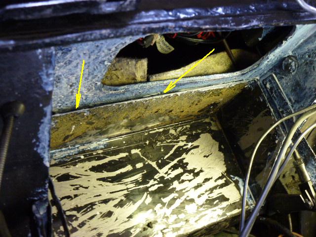 Nachdem ich mich bis aufs Karosserieblech  durchgefräst hatte, kam noch ein weiterer, halbhoher Kasten zum Vorschein. Der war nur an den Seiten punktgeschweißt und aus extrem harten Blech gefertigt, vermutlich reichlich Vanadium drin, denn es ließ sich kaum bohren.
