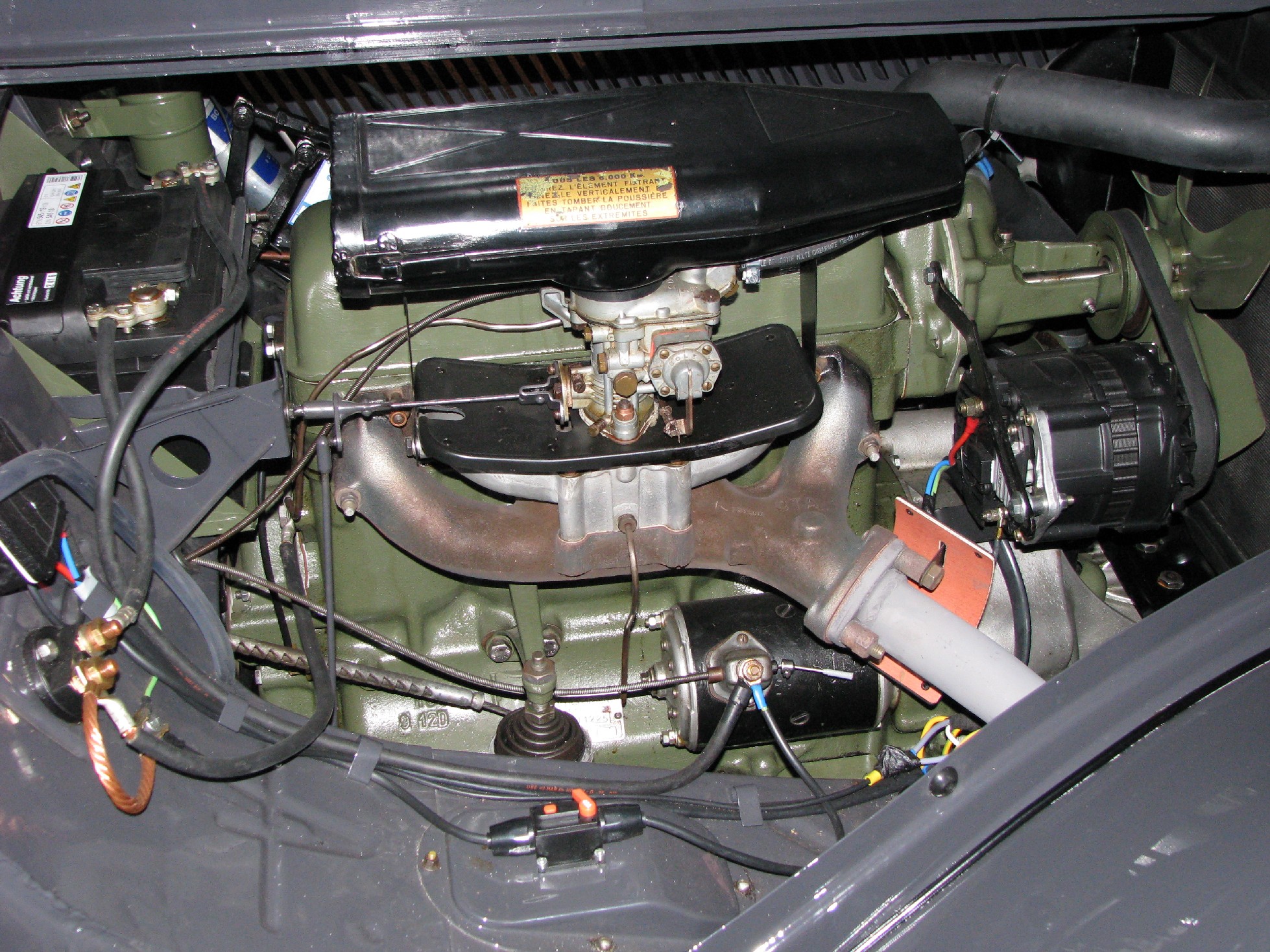 Moin, links hast Du wahrscheinlich den 481.480 für 11 Perfo von 04/1950 - 05/1955 und 11 D von 05/1955 - 06/1955. Deine Angabe von 30 mm beziehen sich worauf? Der Einlass oben am Vergaser sollte 32 mm betragen. Montiert waren darauf 32er Vergaser von Solex oder Zenith. Rechts hast Du wahrscheinlich 457.663 für 11 D von 06/1955 bis Ende in 1957 mit Einlass oben am Vergaser mit 34 oder 36 mm (im ET-Katalog fälschlich mit 32 mm bezeichnet), montiert mit Solex PBIC 33 und Zenith 36 WI sowie die letzten Produktionswochen 1957 mit Solex PBIC 34 und dem um 90 Grad gedrehten Vokes-Luftfilter mit der Einbuchtung oben für die Haubenschiene - sehr seltene Version, siehe Foto, keine Bastelei, ich kenne insgesamt 3 solcher späten 1957er Modelle mit dem 34er Solex und dem Vokes-Luftfilter. Der Witz an der Geschichte ist, dass es Ansaugkrümmer 457.663 gibt, die im Guss die ET-Nr. 481.480 eingeprägt haben.