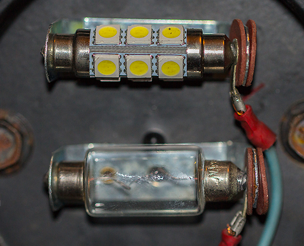 Die Scheibe innerhalb der Chromringes herausgenommen und durch rotes Plexiglas ersetzt. Dann dahinter einige 5mm hochleistungs LEDs montiert (gibt es z.B. bei conrad.de), wobei jede einzelne durch einen passenden Vorwiderstand ergänzt wurde, damit bei 6V der Diodennennstrom fließt. Alle parallel geschaltet. Seitdem ein sehr gutes Bremslicht.  Der Tüv meinte: "so etwas gabs aber 1953 noch nicht". Ist aber akzeptiert, da es der Sicherheit dient. Ist allerdings nicht eingetragen, aber wie schon gesagt, läuft seit 15Jahren.