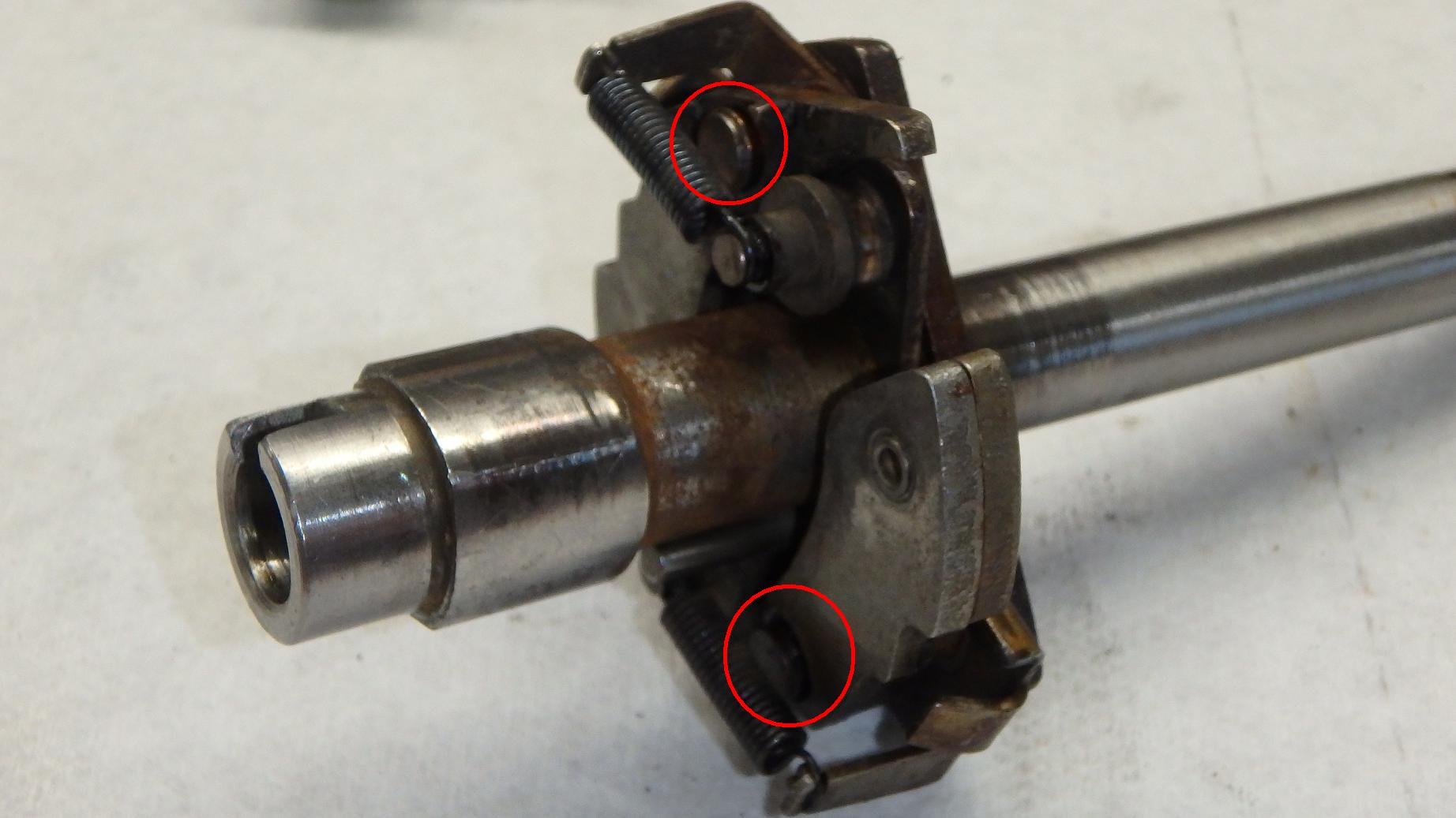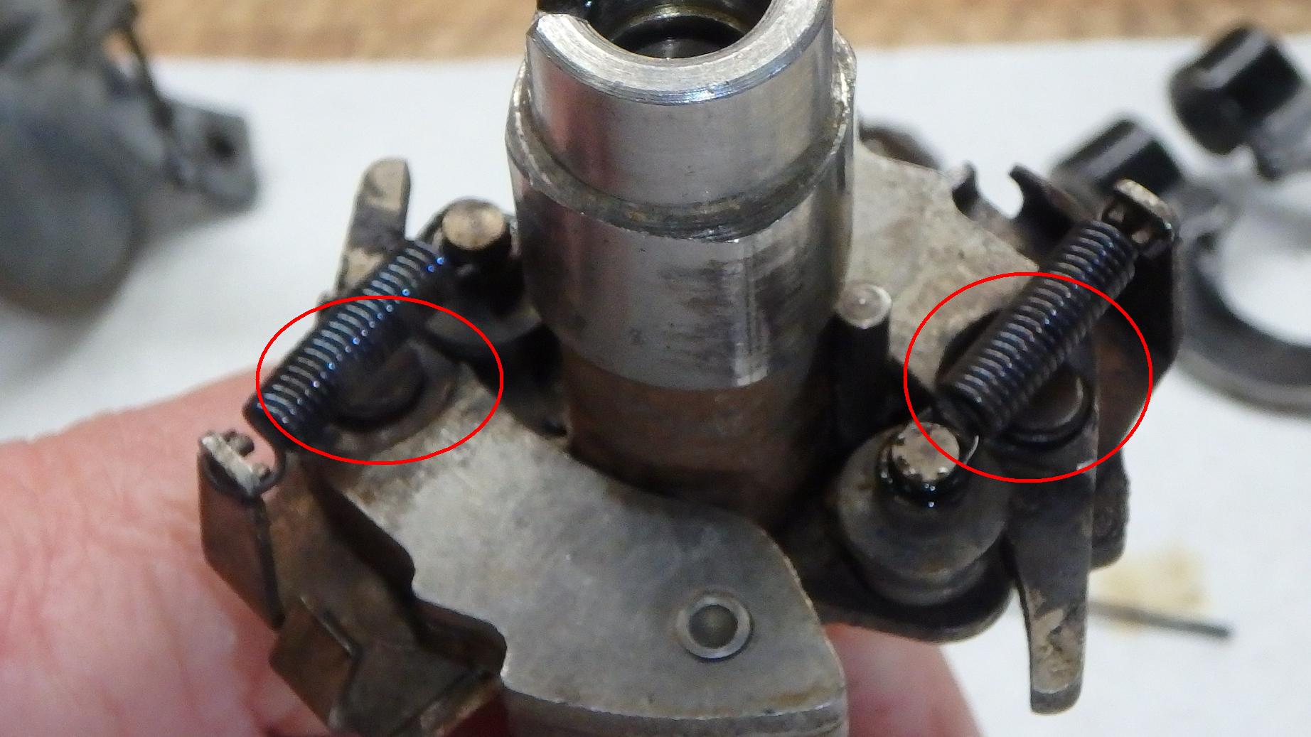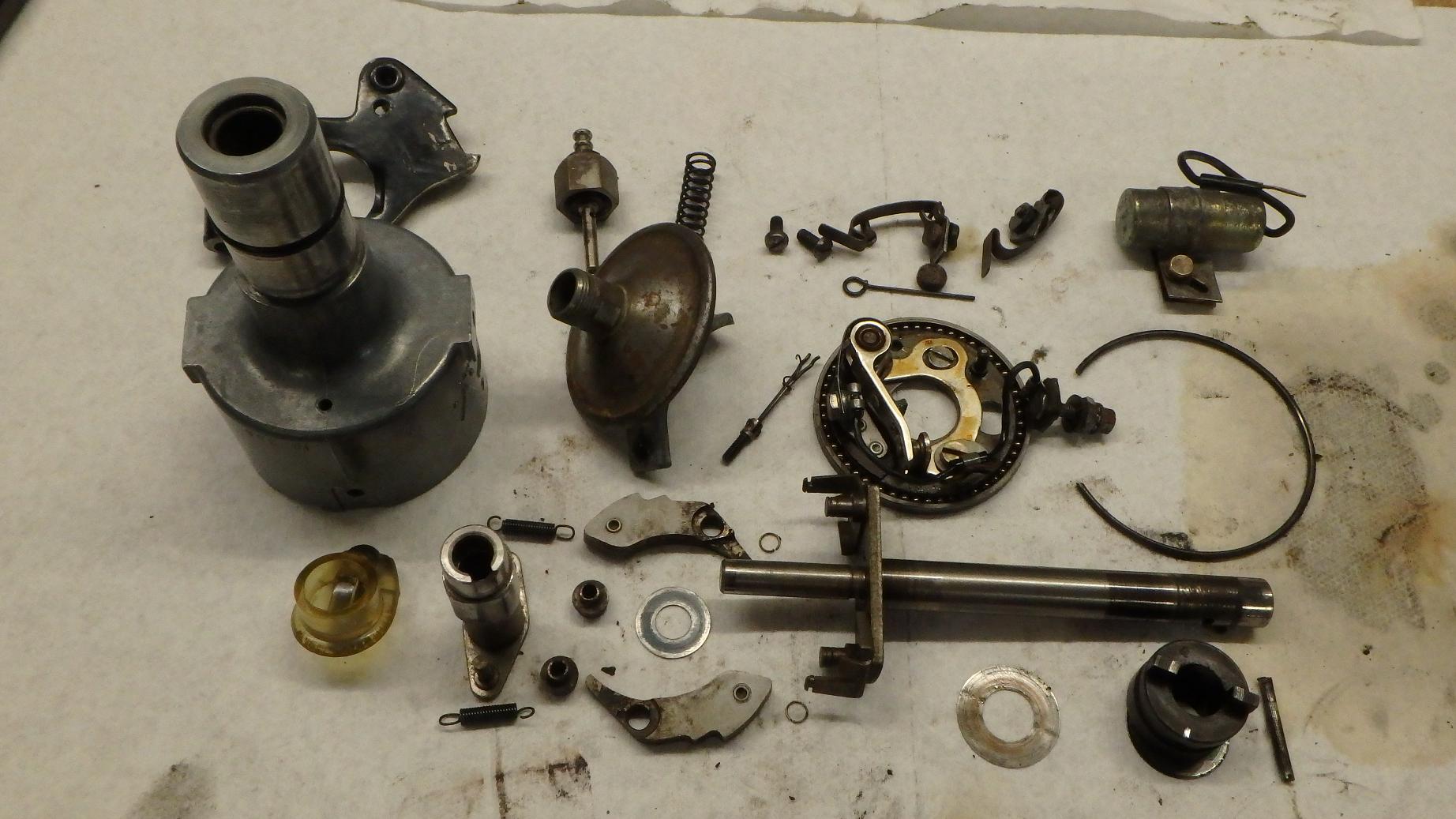 Aber da gibt es noch mehr, im Untergeschoß sozusagen, vor den Augen der Öffentlichkeit verborgen und dennoch von großer Bedeutung: die Fliehkraftverstellung! Und dort findet sich dann Problem Nr.2. Die beiden kleinen Achsen der Fliehgewichte sind völlig ausgejackelt, alles furztrocken und rostig. Die quietschen schon beim Drehen! Wenn da auch noch Luft ist- wo soll denn da noch ein präziser Zzp herkommen? Es zündet mal zu früh, mal zu spät, und gelegentlich auch mal passend- ein unbefriedigender Zustand!