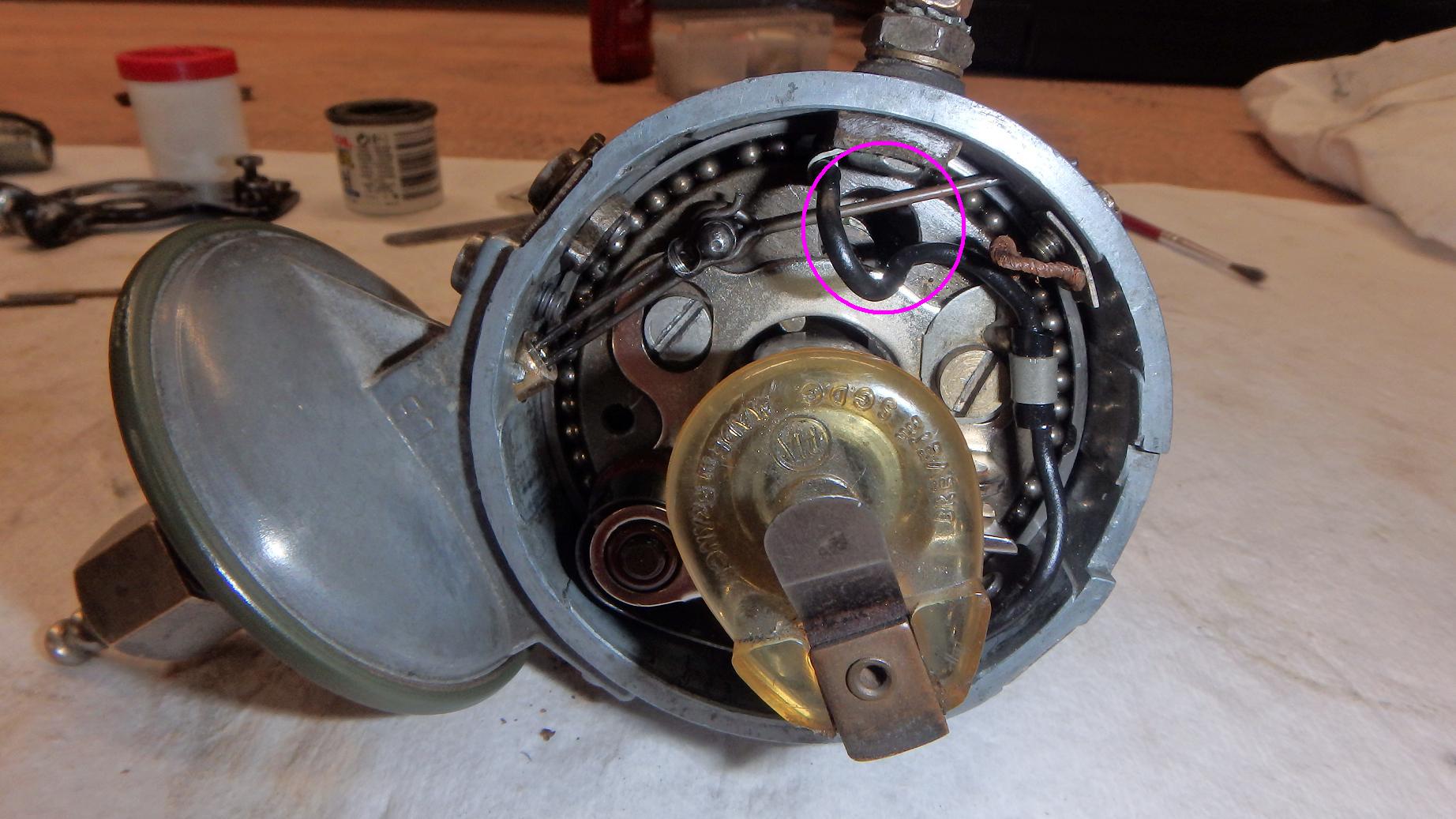Die kleine Kuppelstange, die Unterdruckmembran und Unterbrechergrundplatte verbindet, hat mächtig viel Spiel an dieser Stelle. Mit diesem Stängchen wird die Grundplatte sozusagen verankert, und wenn da Luft ist, wird der Zzp ungenau.