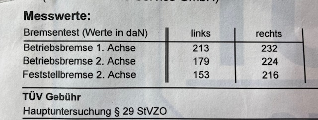 Moin Meini, die neuesten mir vorliegenden Bremswerte (Okt 22) siehe angehängtes Foto, Im Oktober habe ich nen neuen TÜV- Termin. Bin gespannt wie die Werte dann sind. Grüße Thom