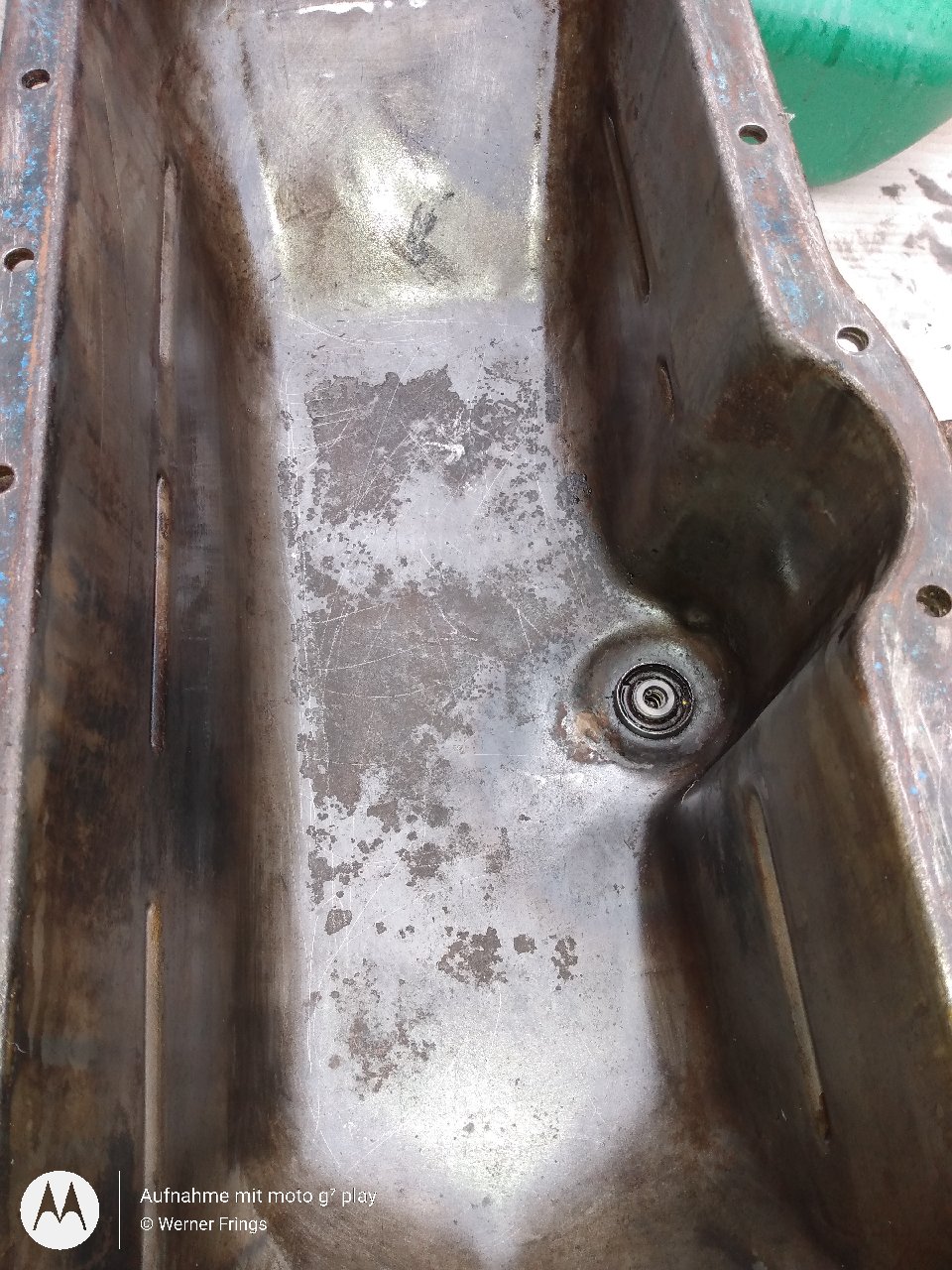 Das Bild zeigt die Ölwanne, sauber und ohne Schlamm, keinerlei Ablagerungen oder sonstige Verschmutzung. Sie wurde lediglich kurz mit Bremsenreiniger abgesprüht.