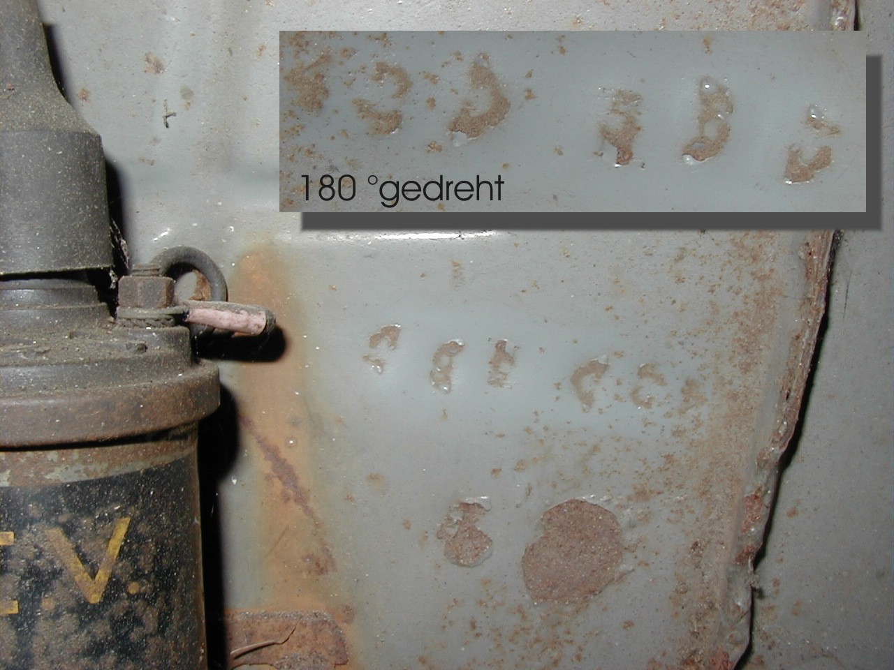 Re: FahrgestellnummerHallo jos, Sie sollten die Bilder jetzt sehen bzw. Downloaden können. Mit freundlichen Grüßen LOUIS INTERNET Re: Fahrgestellnummerdanke, danke, Naja...., da muss man sich die Nummern aber erdenken! Damals gab es wahrscheinlich noch nicht die Werkzeuge wie Heute! Werde dann mal heute Abend bei meinem Auto schauen. Jos Re: FahrgestellnummerJa, Jos, das stimmt. Die Markierungen wurden ziemlich rustikal angebracht. (siehe Foto) Falls Dein Auto im Motorraum schon mal überlackiert worden ist, dann kannst Du dir auch helfen, wenn Du von innen unter dem Amaturenbrett auf das Blech schaust um den Ort der Einschläge zu finden. Da man damals nicht etwa dort was untergelegt hat beim Einschlagen, haben sich kleine Beulen gebildet, die manchmal von innen besser als von außen zu entziffern sind. Gruß
