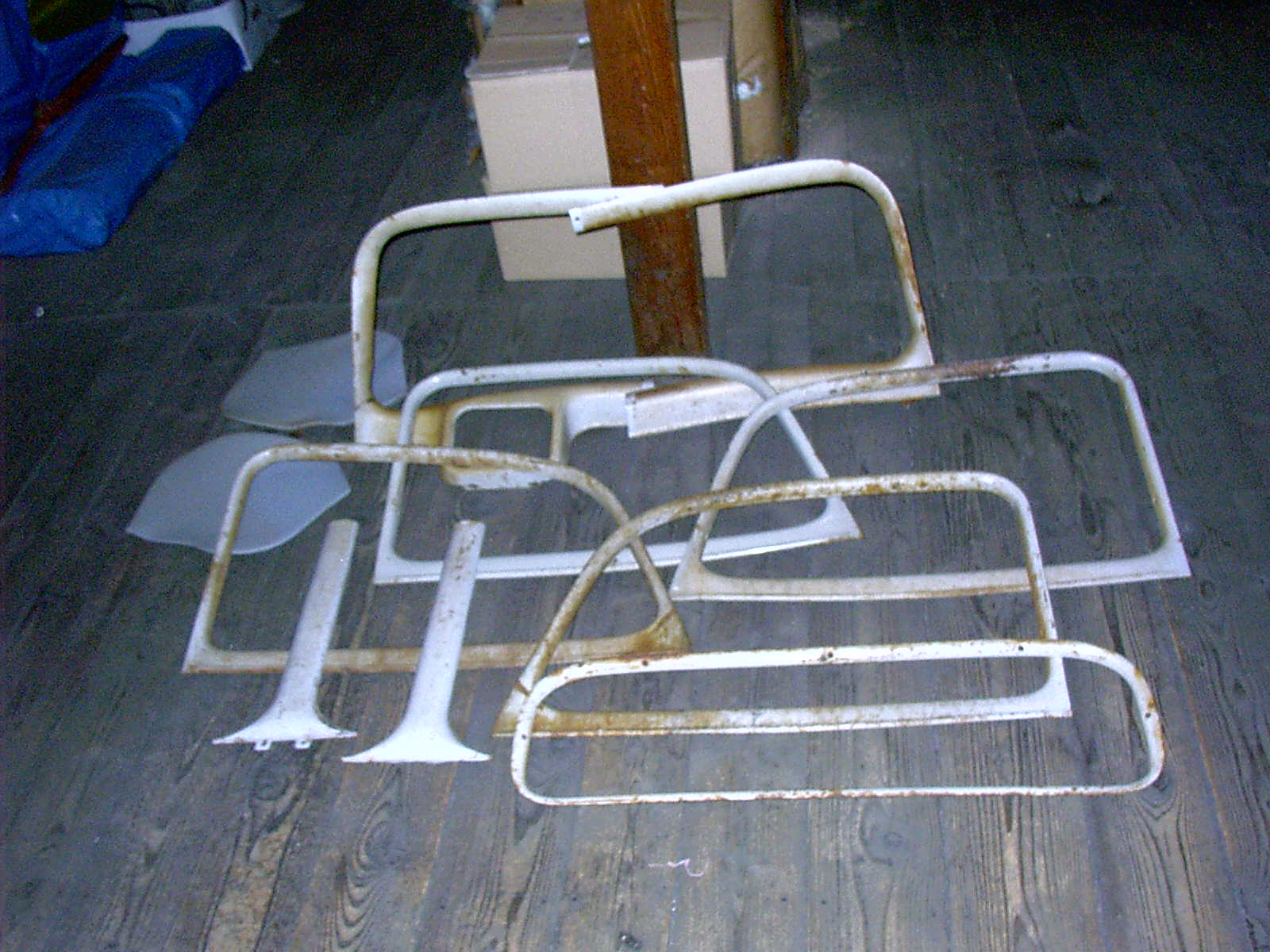 Alle Fensterrahmen Blech grau innen - 4 Türen, Frontscheibe (etwas unten "geknickt", aber zu retten!), Heckscheibe (rostig, aber zu retten);