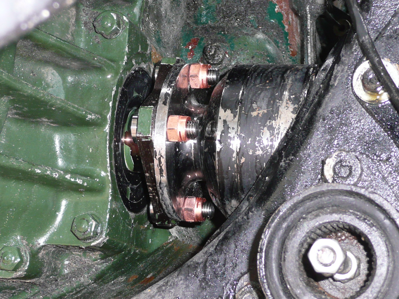 Nun mein Problem: Wie bekomme ich eine Schraube in die beiden Flansche? Eine von der Länge her richtige Schraube passt nicht zwischen Getriebeblock und getriebeseitigem Flansch, da zuwenig Platz ist. (Umgekehrt Mutter auf Getriebeseite funktioniert ebenfalls nicht.)