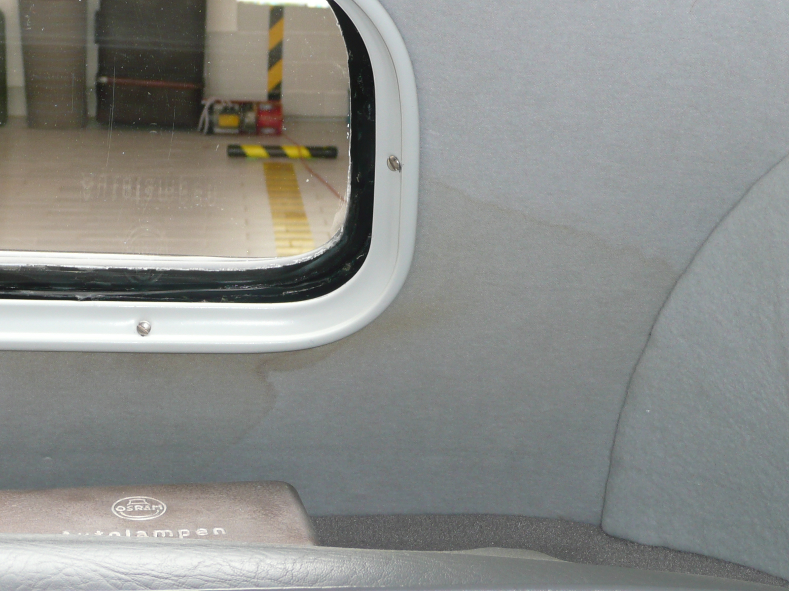 mit Schrecken habe ich festgestellt, dass sich auf dem neuen Autohimmel unterhalb und seitlich der Heckscheibe ein pfannkuchengroßer Wasserkranz gebildet hat.