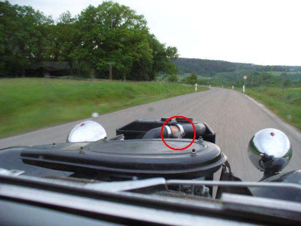 Ist eigentlich ganz simpel und billig, 2 dicke Stücke Kupferrohr, untendran sind je 1 dünnes Kupferrohr weich angelötet. Daran habe ich die Heizung angeschlossen, für den Probelauf mit Klarschlauch "kurzgeschlossen". Im oberen Rohrstück steckt- per Hebelchen und Bowdenzug vom Fahrersitz aus drehbar- eine Drosselklappe aus einem alten Entenvergaser. Die Welle ist mit einem O-Ring abgedichtet.
