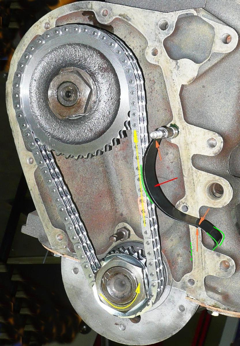 Meiner Meinung nach müsste der Kettenspanner umgekehrt montiert werden; das lose Gleitfederende nach oben, also in Ablaufrichtung. Dann würde sich die Feder in Kettenlaufrichtung strecken können, sich also der Belastung anpassen und nicht wie hier in dem Fall, gegen die Belastung auflaufen und dadurch die Reibung noch verstärken.