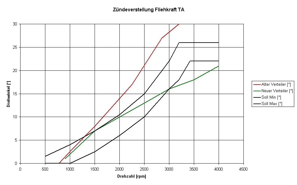 Ih habe vor 20.000 km mal einen gebrauchten Verteiler eingebaut, der noch "ganz gut" aussah. Neulich auf den Leistungsprüfstand stellte ich fest, dass mir 10 PS ausgehend von der Nennleistung, 56 PS fehlen (Verluste im Antriebsstrang sind berrücksichtigt). Dies nahm ich zum Anlass die Ventilsteuerung und die Zündung zu überprüfen. VEntilsteuerung ist ok (Überschneidung im OT, Hub der Ventile auch ok, Öffnungsbeginn auch ok). Nur die Fliehkraftverstellung des Verteilers arbeitet zu forsch. D.h. der Zündzeitpunkt wird zu stark vorgezogen. Der neue Verteiler (mechanisch, Ducellier, neu, verfügbar bei Schaefer)ist da schon eher im Sollbereich, siehe angefügtes Diagramm.