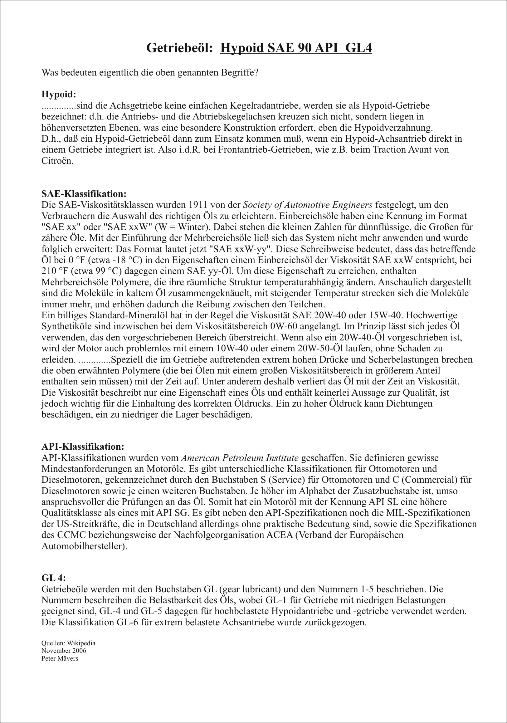 Wirklich uralt, dennoch sollte auch Wolfgang eine Antwort bekommen, ... ... denn inzwischen haben sich auch die Getriebeöle (z. B. GL 6) veränder und erweitert, da die Anforderungen gestiegen sind. Auch die SAE Werte sind etwas verschoben worden. Leider auch die Inhaltsstoffe wie Zink/Phosphat/Schwefel-Verbindungen, etc. (Umwelt). Typische Hyp-Öle bringen nichts in unserem Schalt-Transaxle, im Gegenteil. GL 3 - 4 ist richtig, MoS2 Zusatz grundsätzlich falsch. Wer überwiegend in der warmen Jahreszeit und Langstrecken fährt, nimmt SAE 90; Kurzstrecken oder gar Winterfahrer können SAE 80 einsetzen.