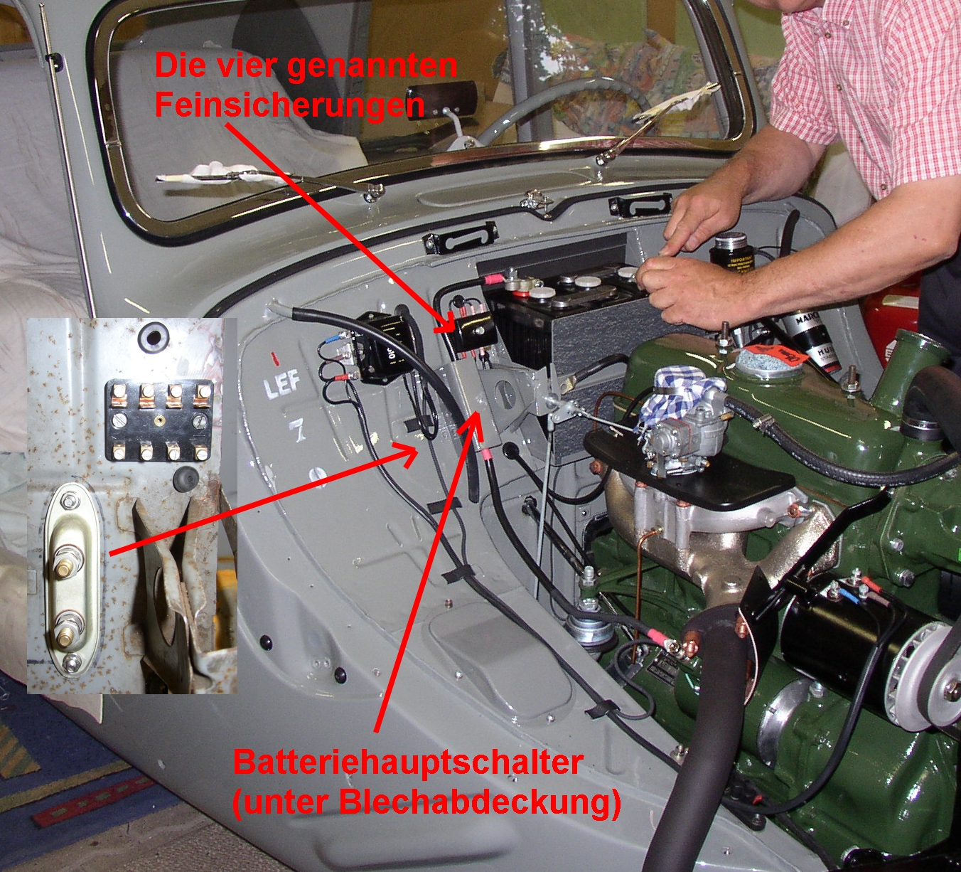Ich habe bei meinem Auto mit Feinsicherungen lediglich den Wischermotor, die Bordsteckdose, die elektr.Warnblinkanlage und die Mituterie abgesichert. Darüberhinaus habe ich einen Batterie-Trennschalter in der 32 mm² Plusleitung zwischen Batterie und Anlasser montiert. Damit trenne ich bei Fahrzeugstillstand die gesamte Fahrzeugelektrik von der Batterie. (Marderprobleme, Diebstahlschutz, etc.). (Foto anbei) Wie hier im Forum aber schon besprochen, ist es eigentlich besser, diesen Trennschalter in die Minus-Leitung zu legen.