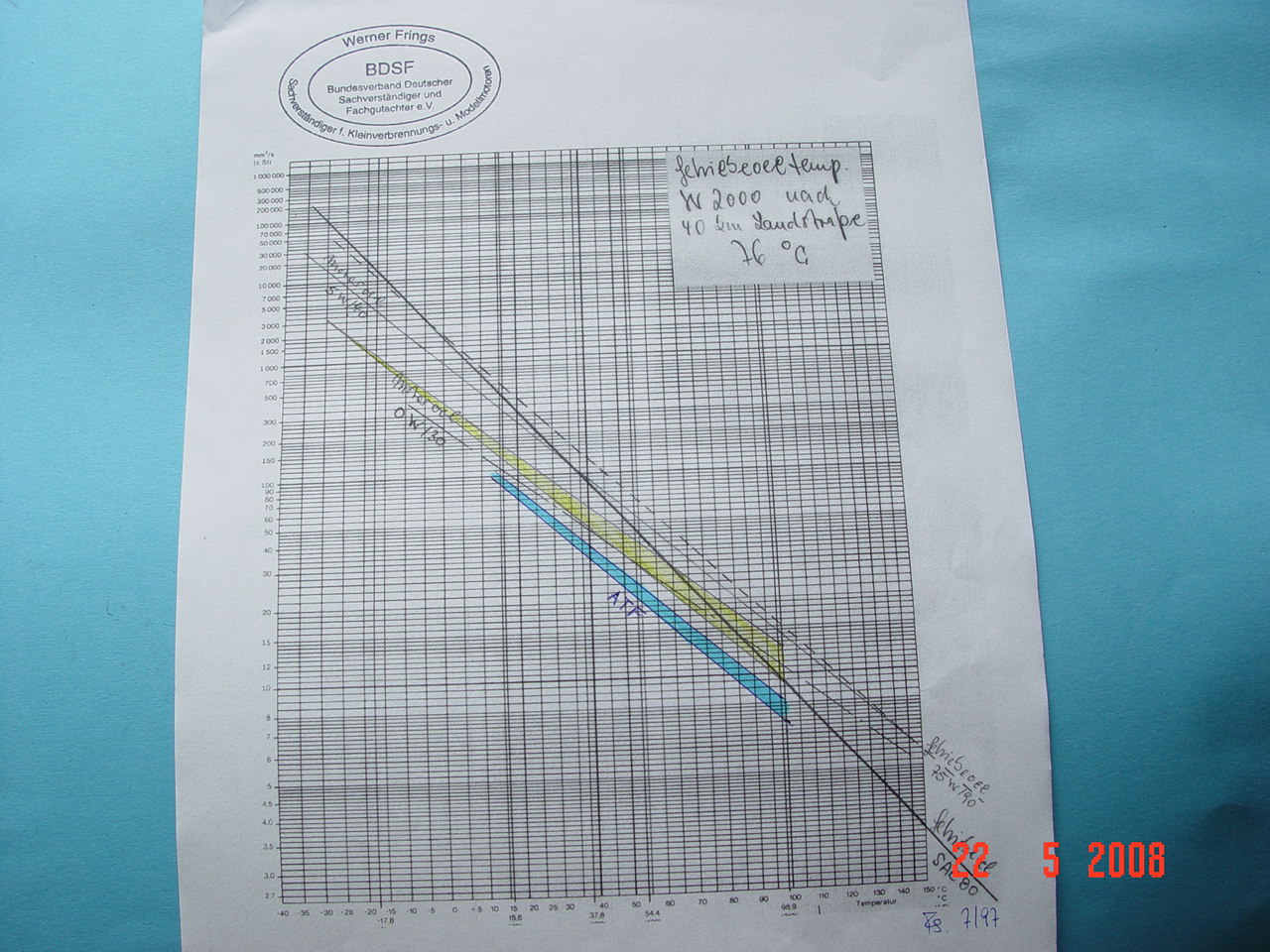 Zum tatsächlichen Vergleich dann mit dem von mir im Fahrbetrieb eingesetzten 10W-40 Feststofföl. Diese Werte werden in eine VT-Tabelle eingetragen, und man kann schön darüber gübeln und mit Kreuzlinealen Vergleichspunkte herauspicken.
