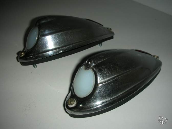 Hier ein Bild der Positionsleuchten. Hersteller Maly, Frankreich. Originalkarton vorhanden. Die Leuchten sind in Zeitungspapier von 1947 eingewickelt. Gesamtlänge 19 cm, Abstand der Schrauben 10 cm. Schwarz emailliert. Rotes Prisma an der hinteren/oben zum Erkennen der Funktion. Mattweißes Glas mit eingeprägtem Schriftzug "MALY". Gewicht 200 g, also kein billiger Kram. Dichtung dabei. Ich hatte die Leuchten mal für meinen 11er (1948) gekauft, habe sie aber wegen der Blinker an den Kotflügeln, die ich eigentlich wegbauen wollte, nicht montiert. Weitere Bilder kann ich gerne per email schicken. Preis: Faire Offre. Gruß, DanCit