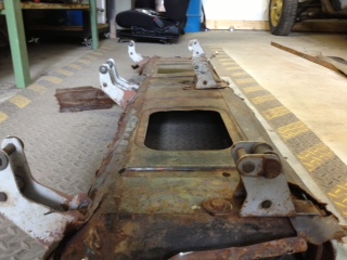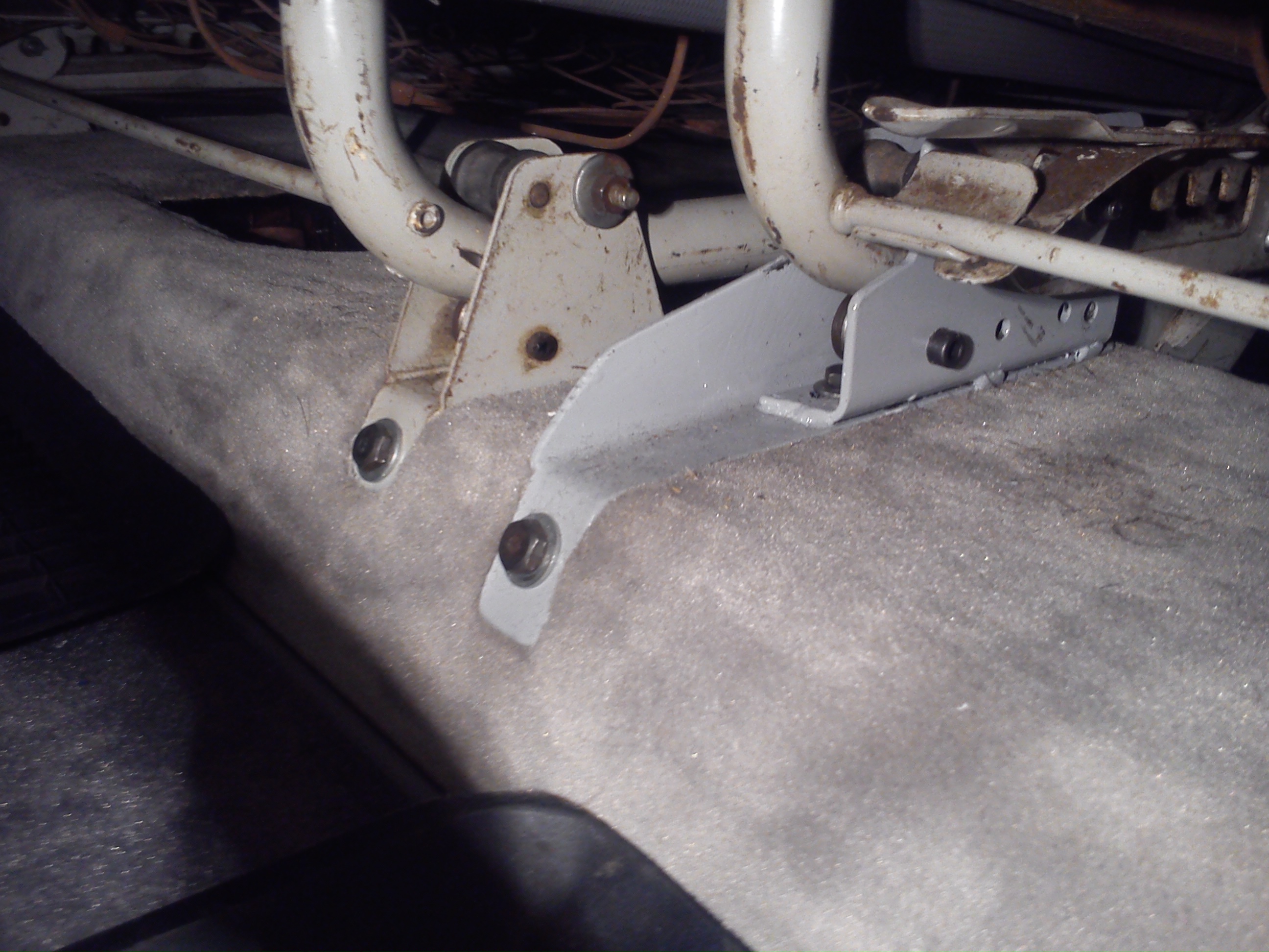Ich habe die vorderen Halter geradegebogen und auf dem Tunnel verschraubt. Für die hintere Halterung eine neue Stütze gebogen/ geschweißt. Das könnte man auch noch in die Höhe bauen.