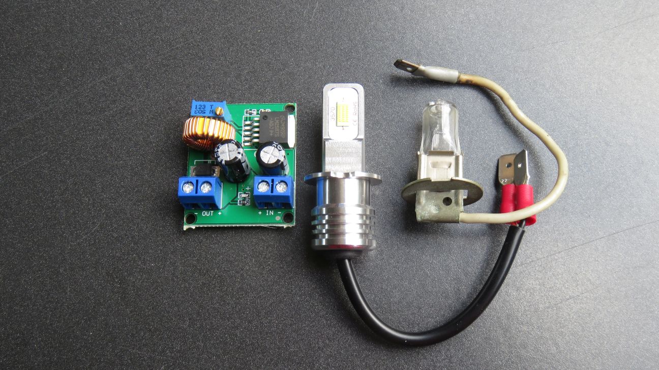 Das Bild zeigt den Wandler, die H3 LED und die H3 Halogen.
