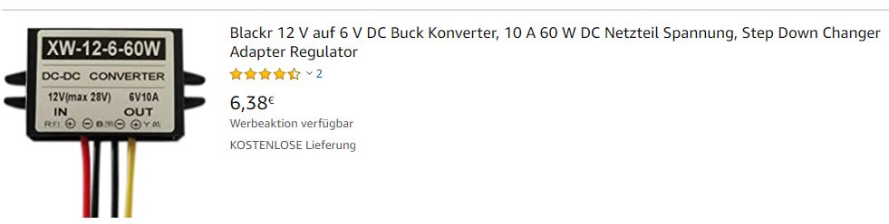 Moin, Made China hat 12Volt- 6Volt Wandler mit 25 Amper Ausgang für wirklich kleines Geld. Lieferung innerhalb einer Woche. Und ja, sie funktionieren und bringen ihre Leistung auch bei Dauerbetrieb (3h) ausprobiert. Gruß aus dem jetzt auch verschneiten Hamburg, Rainer