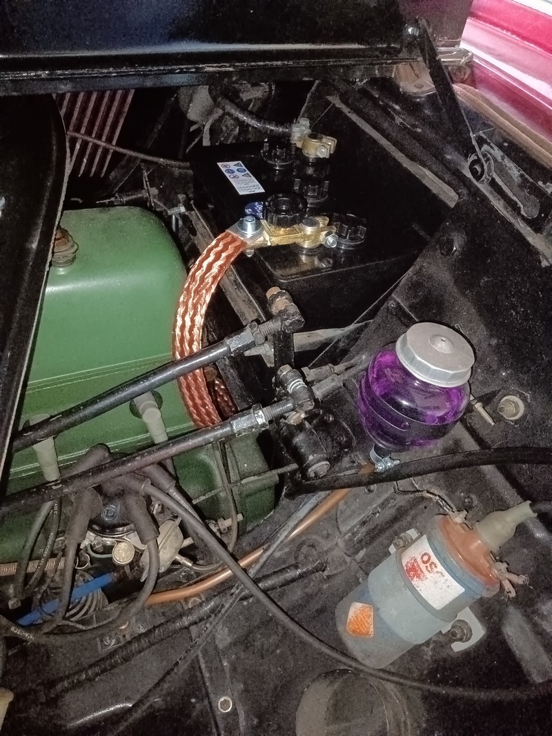 Heute hatten wir unsere erste, richtige Ausfahrt. War richtig schön, bei dem tollen Wetter! Kleine Rundfahrt mit einem Stop an einer Eisdiele. In den letzten Tagen hatte ich Säure in die neue Batterie gefüllt und sie einen Tag später geladen. Das neue Masseband ist auch eingebaut. Allerdings sieht es so unbehandelt zu neu aus (siehe Foto). Der Anlasser dreht nun schön durch. Das Lenkrad muss nun noch um ca. 90 Grad gedreht werden da es im Augenblick mit einer Speiche vor den Instrumenten steht. So ab 60 km/h hört man rechts vorn an der Windschutzscheibe Windgeräusche und insgesamt muss ich noch so manches Geräusch im Motorraum aufspüren und beseitigen, wenn das geht. Was mir auch auffällt, hatte ich vor einiger Zeit schon mal geschrieben, der Motor läuft recht rau wenn Vollgas gegeben wird. LG Wolfgang