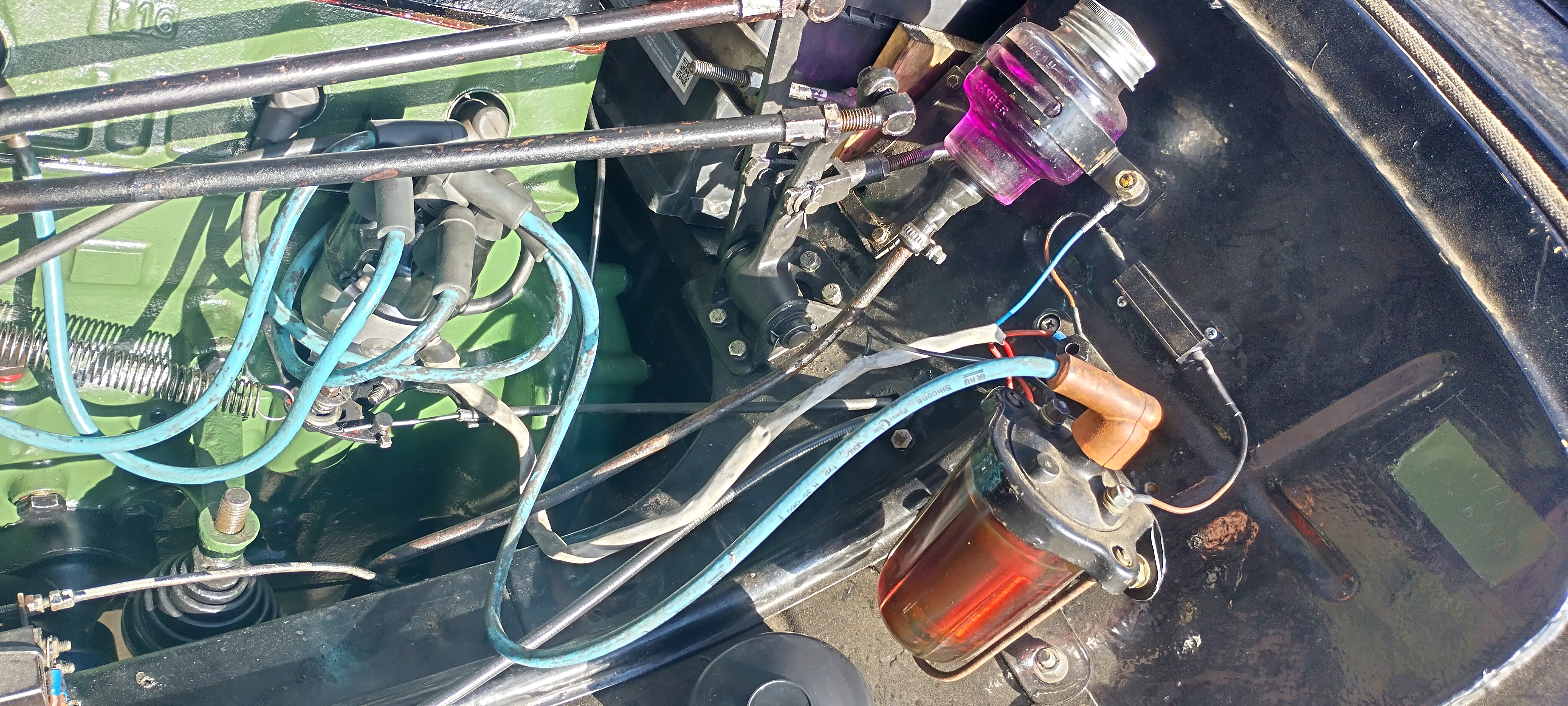 So sieht die Glaszündspule aus. Ich wollte gerne ein paar Marmeladengläser im Motorraum haben :-) Die Benzinpumpe hat natürlich auch eine Glasdeckel. man beachte im Anschnitt den Ölfilter von Nesi. Ich bin sehr zufrieden.
