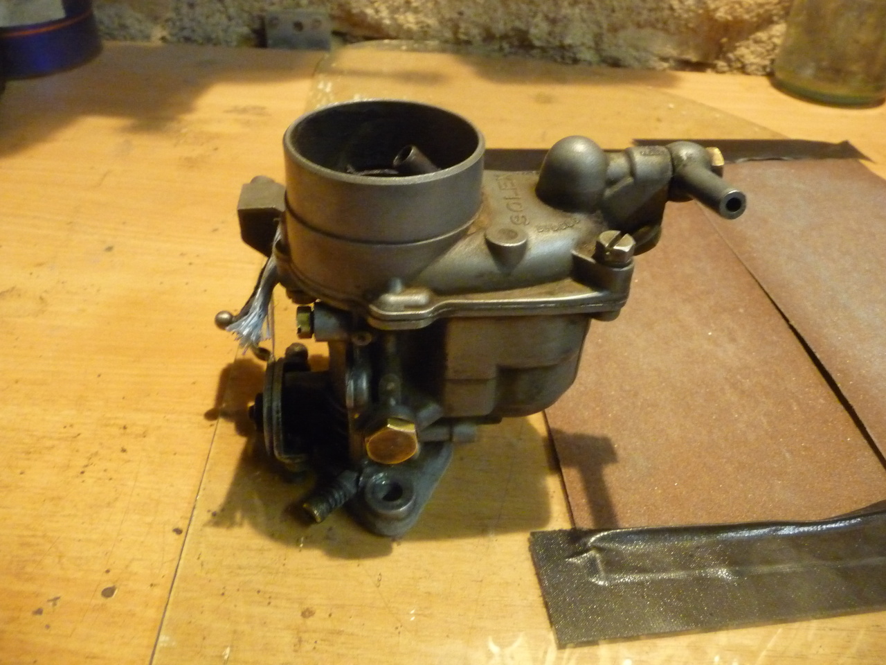Heute ist ein gebrauchter Vergaser Solex 34 PBIC eingetroffen den ich bei Ebay gekauft habe. Ist ein Original das ich nun überarbeite. Macht auf den ersten Blick einen brauchbaren Eindruck obwohl er völlig mit Ablagerungen von vielen Jahren bedeckt ist, was aber natürlich auch zu erwarten ist. Der Befestigungsflansch ist verzogen und muss plan gefräst werden. Evtl. könnte man das auch mit einer Feile plan feilen. Die Welle hat natürlich auch Spiel.