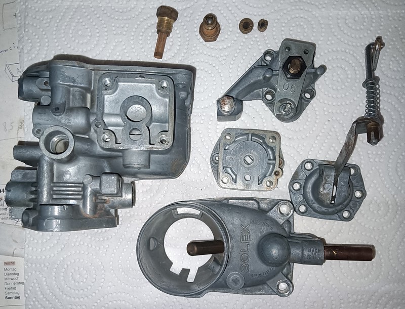 Ok, da hast du natürlich absolut recht! Wie ist es denn mit Nuten in die Drosselklappenwelle drehen und Dichtringe einsetzen? Das ist ja eigentlich auch eine Möglichkeit um Nebenluft auszuschließen und das Vergasergehäuse bleibt unangetastet. Der Vergaser ist jetzt zerlegt und mit Bremsenreiniger grob gereinigt. Die Verkrustungen sind schon echt heftig aber es wird schon. Einige Teile waren bereits im Ultraschallbad und sind jetzt schon gesäubert. In einem zweiten Bad werde ich mal versuchen noch etwas für das Aussehen zu tun ;-) Die Düsen etc. von meinem 34iger haben folgende Werte: Hauptdüse 140 Luftkorrekturdüse 165 Leerlaufdüse 50 Leerlaufluftdüse 130 Schwimmernadelventil 1,7 Pumpendüse 50 Starterluftdüse 4 Starterkraftstoffdüse 105 Aktuell würde ich jetzt nur ein neues Schwimmernadelventil 2,0 kaufen und natürlich einen Reparatursatz mit allen Dichtungen, der Pumpenmembran etc. Bleibt nur die Sache mit der Drosselklappenwelle...